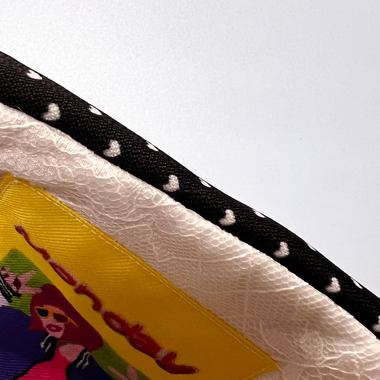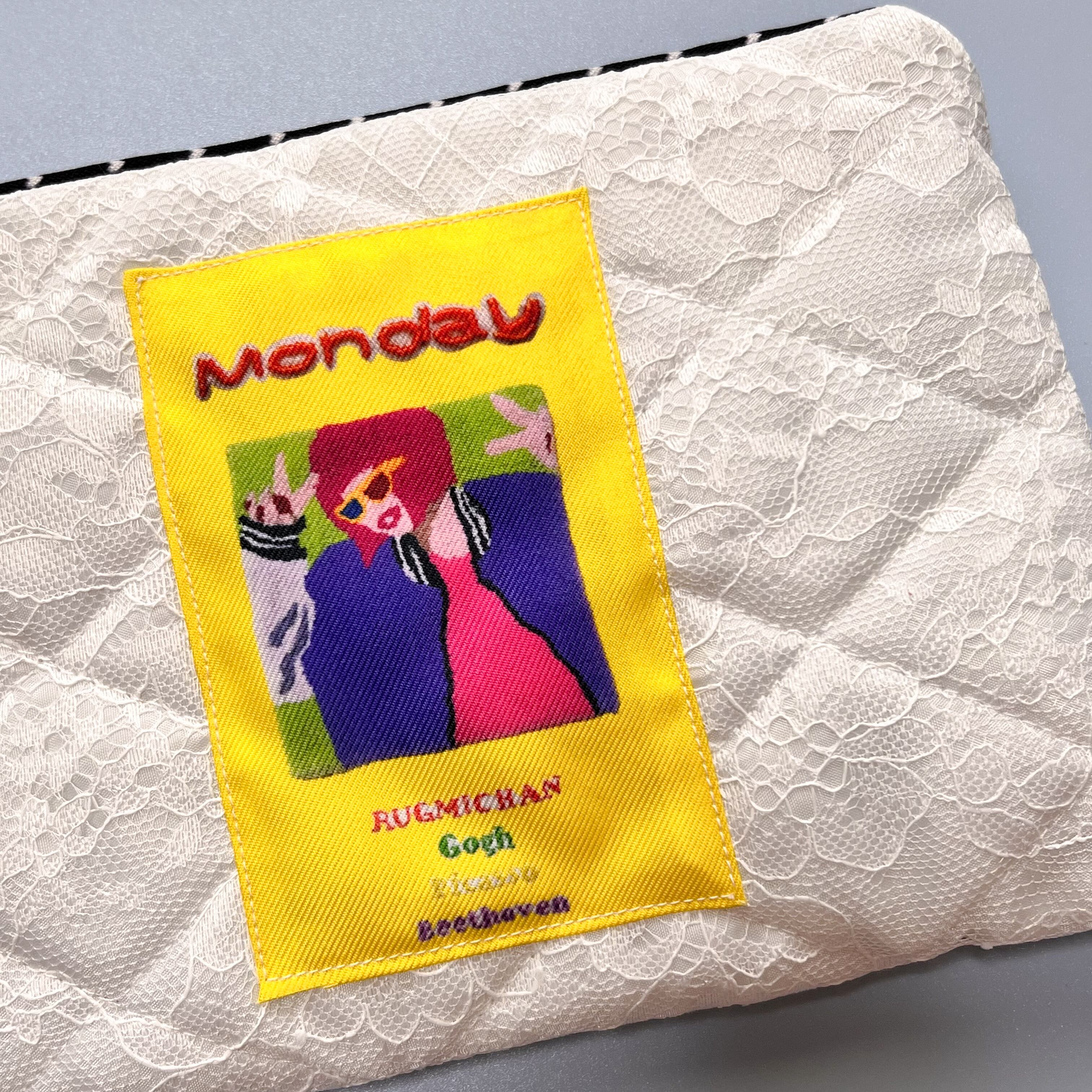 レース✖️キルティングの表生地には、3dメガネを掛けたパリピガール、アツコの刺しゅうをプリントしたワッペンが付いています。