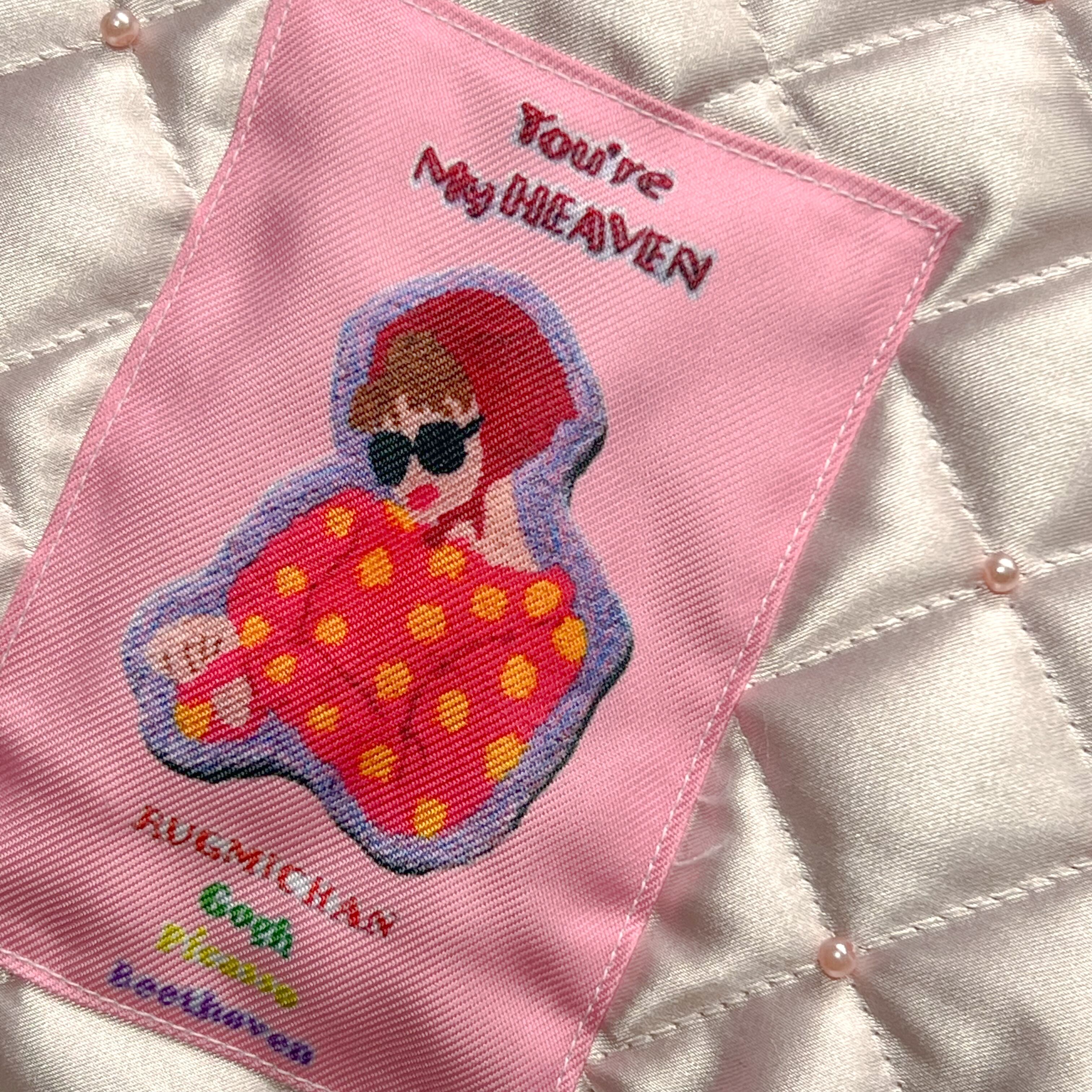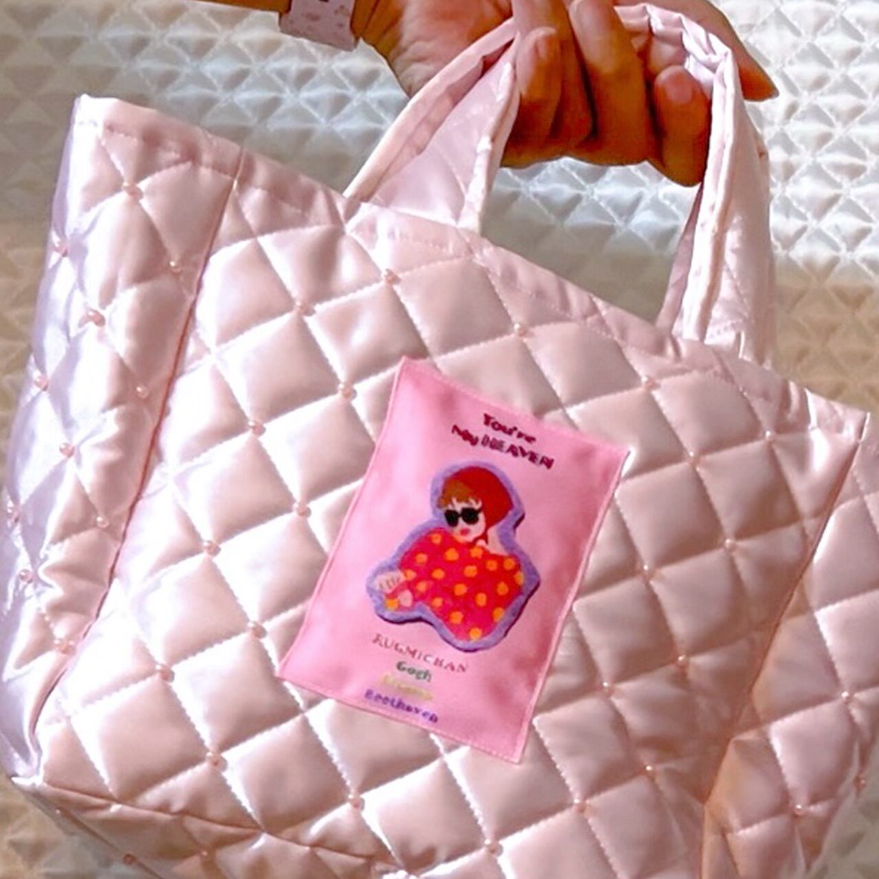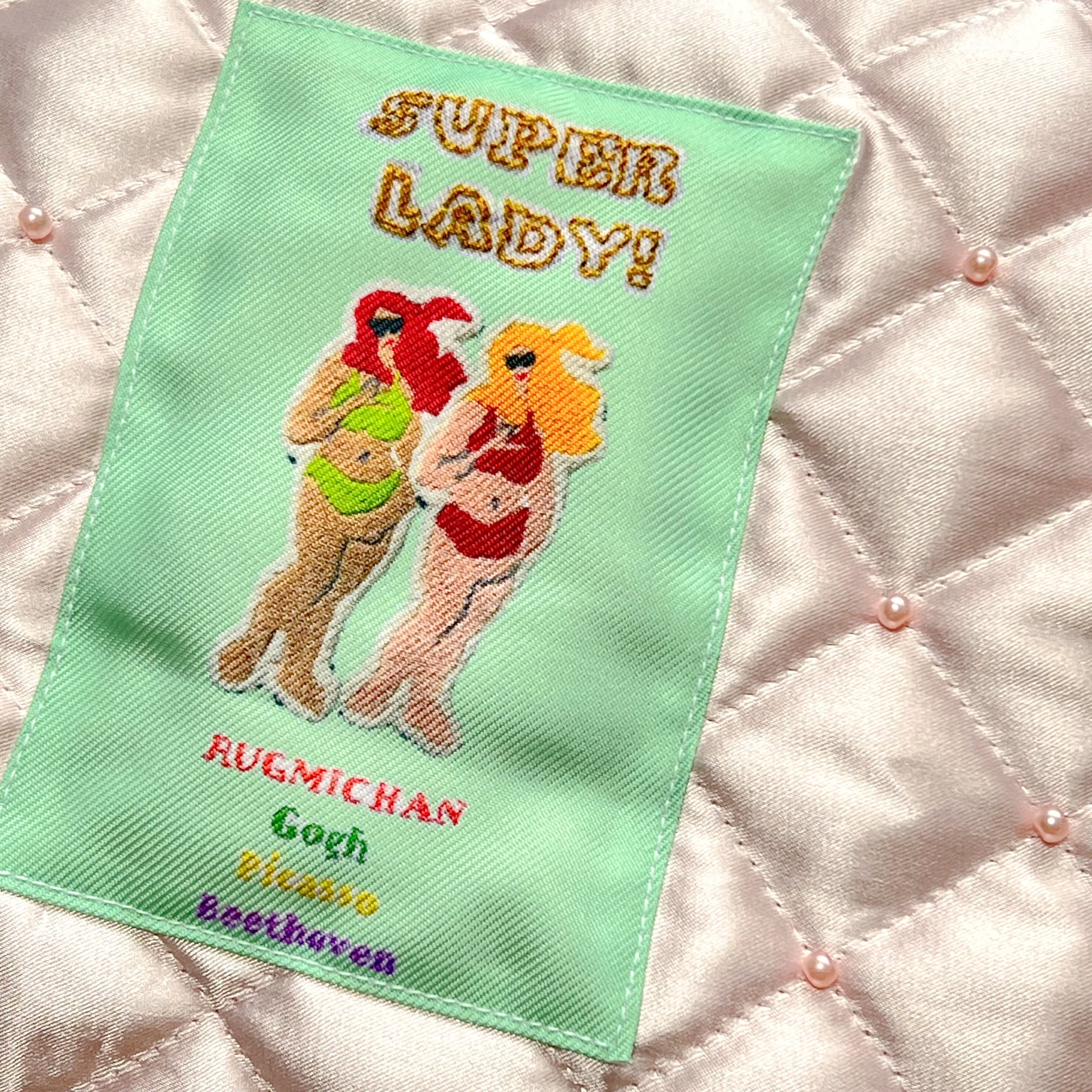 パールのビーズがついたキルティングの表生地には、負けない赤ずきんジュンコとヴィーナスに憧れるガールズのタフティングアートがプリントされたワッペンが付いています。